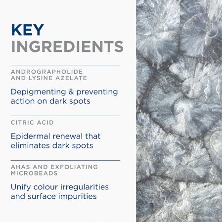 تنظم تركيبة المواد الفعالة والحاصلة على براءة اختراع آليات العمل الحيوية التي تتسبب في تشكل البقع الداكنة، لإضفاء تأثير مشرق على البشرة والوقاية الأمثل.